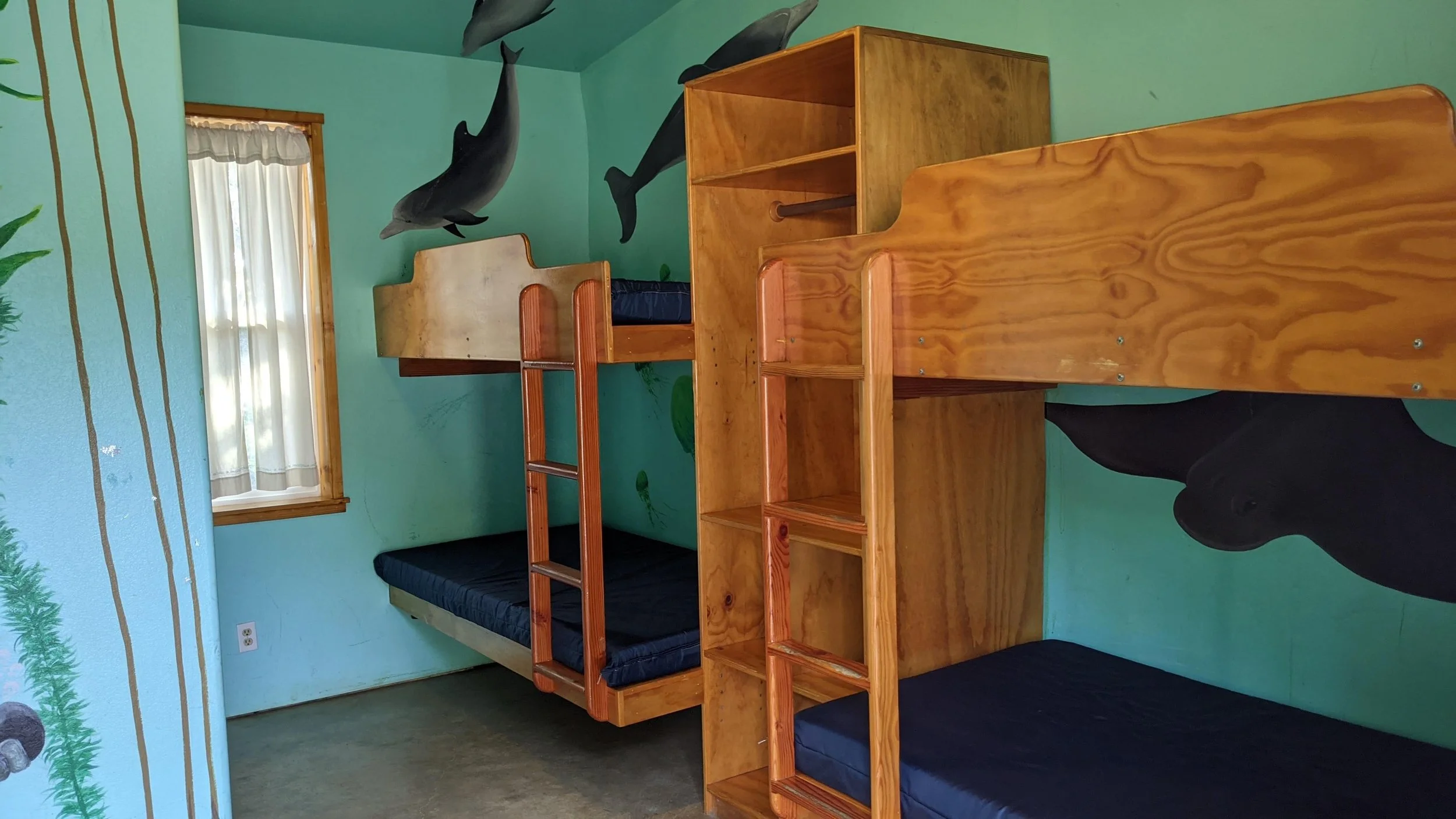 Private, cozy, and colorful cabins-one for each family! Each cabin contains it’s own bathroom and shower, 10 bunk beds, and electricity! ADA accessible cabin available for those who need it.